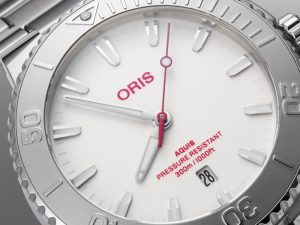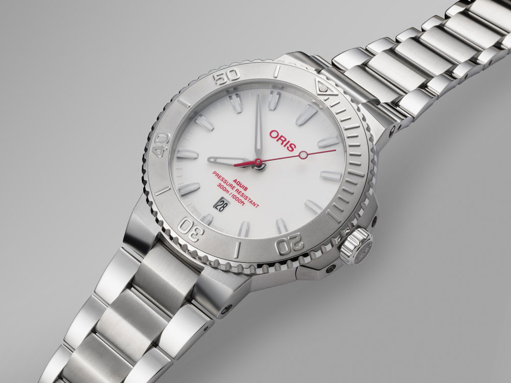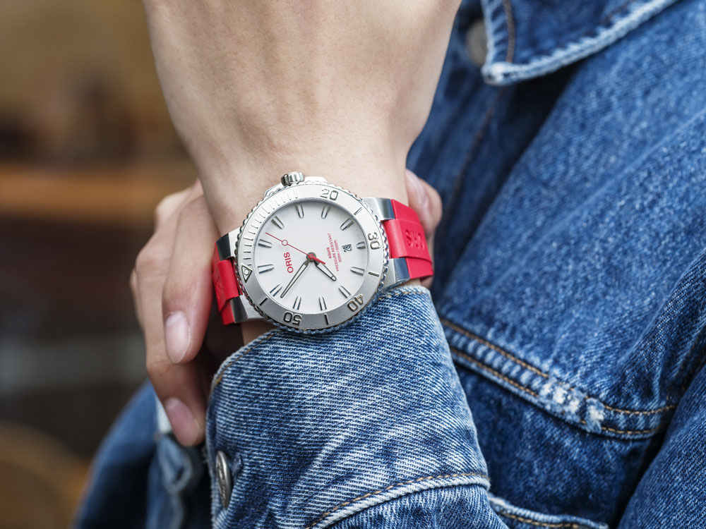 オリスでは初となる日本国内限定モデル。2025年にモデルチェンジを果たしたニューアクイスをベースに、純白のダイヤルに赤いロゴと秒針を採用しました。白と赤は日本とスイス両国の国旗の色でもあり、スイス時計の卓越した技術とオリスが日本文化に寄せる敬意が表現されています。ベースモデルとなったニューアクイスは基本的なスタイルで既存モデルを踏襲しながらも、ケース、ブレス、ダイヤル、針などのディテールが徹底的にブラッシュアップされ、都会的なダイバーズウォッチとしてよりスマートでとスタイリッシュな印象に仕上がっています。限定モデル特典としてSSブレスに加えレッドラバーストラップが付属。クイックチェンジシステムが採用されているので、工具なしでワンタッチでの付け替えが可能です。限定数は100本のみでシリアルナンバー入り。当店への入荷も1本のみとなります。