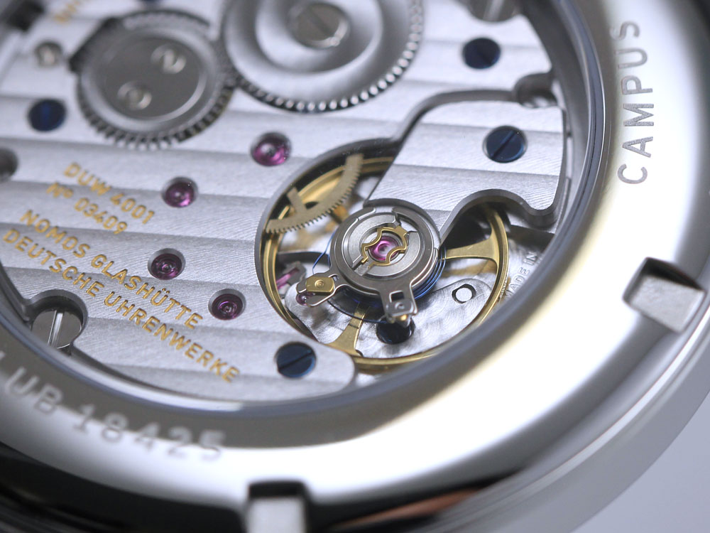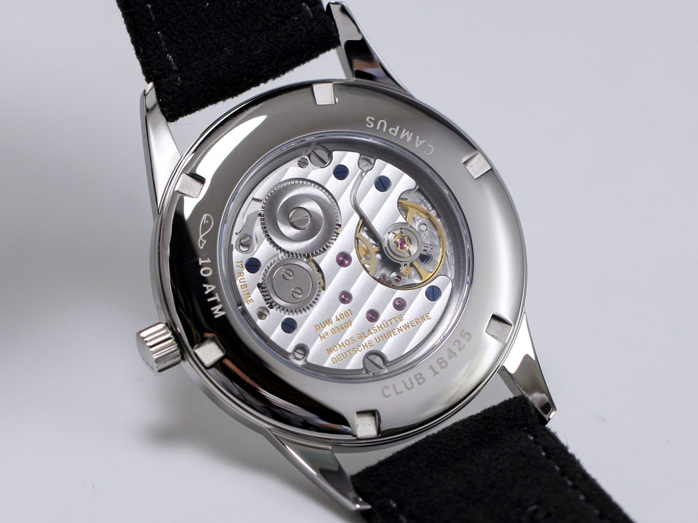 ノモスのカジュアルライン「CLUB(クラブ)」のキャンパスシリーズ。進学や卒業、新たなキャリアのスタートなど、新しい門出にふさわしいフレッシュなデザインが特徴です。クラブのカジュアルな雰囲気は生かしつつ、ローマ数字とアラビア数字を組み合わせたユニークなバイリンガルダイヤルを採用。針とインデックスにはスーパルミノバを施し、暗い場所での視認性も確保しました。裏蓋はスクリューバックの10気圧防水でスケルトン仕様。そこから覗くムーヴメントは何度かのマイナーチェンジを繰り返し、現在のDUW4001では完全な自社生産のマニュファクチュールムーヴメントとなりました。エントリーモデルとは思えない品質とスペックに驚きです。