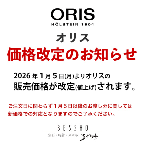 世界的な資材不足や人件費の高騰、昨今のスイスフランの対円為替レート高騰のため、オリスの日本国内価格が改定されます。ご注文のタイミングに関係なく、1/5(月)以降お渡し(もしくは当店を出荷)の分から新価格対応とさせていただきますのであらかじめご了承ください。