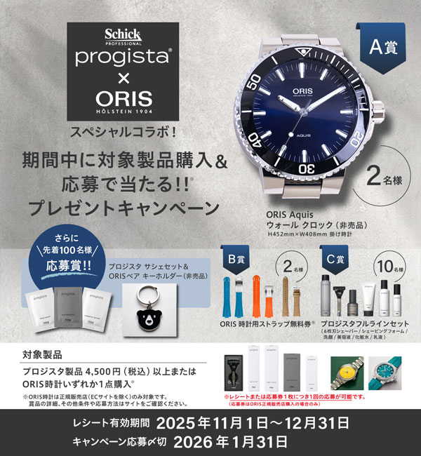 キャンペーン期間中に、販売店舗(EC含む)で 「税込4,500円以上のprogista(プロジスタ)製品」、または正規販売店にて 「ORIS(オリス)時計」 をご購入し、キャンペーンサイトから応募してください。